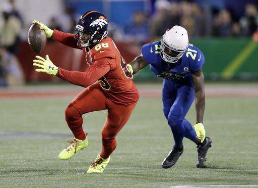 NFC strong safety Landon Collins (21), of the New York Giants, attempts to stop AFC wide receiver Demaryius Thomas (88), of the Denver Broncos, during the first half of the NFL Pro Bowl football game Sunday, Jan. 29, 2017, in Orlando, Fla. (AP Photo/Chris O'Meara) The Associated Press