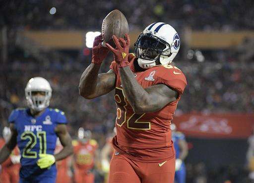 AFC tight end Delanie Walker (82), of the Tennessee Titans, holds on to a touchdown pass, during the first half of the NFL Pro Bowl football game Sunday, Jan. 29, 2017, in Orlando, Fla. NFC strong safety Landon Collins (21), of the New York Giants, is in the background. (AP Photo/Phelan M Ebenhack) The Associated Press