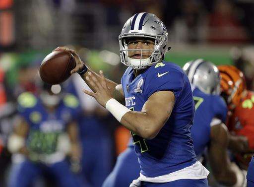 NFC quarterback Dak Prescott (4), of the Dallas Cowboys, looks to pass, during the first half of the NFL Pro Bowl football game Sunday, Jan. 29, 2017, in Orlando, Fla. (AP Photo/Chris O'Meara) The Associated Press