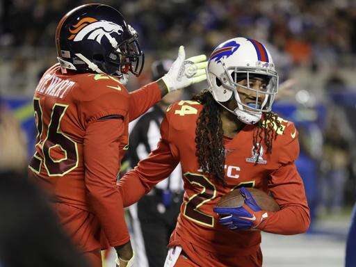 AFC strong safety Darian Stewart (26), of the Denver Broncos, congratulates cornerback Stephon Gilmore (24), of the Buffalo Bills, after Gilmore intercepted a pass in the end zone, during the first half of the NFL Pro Bowl football game Sunday, Jan. 29, 2017, in Orlando, Fla. (AP Photo/Chris O?Meara) The Associated Press
