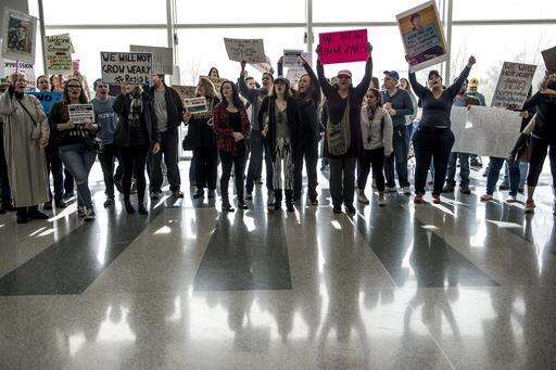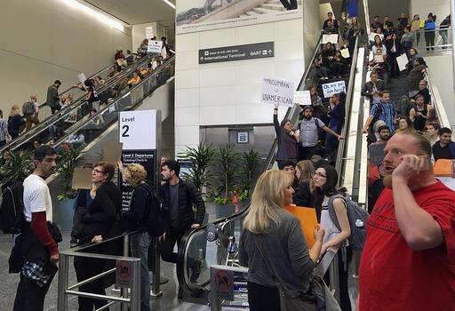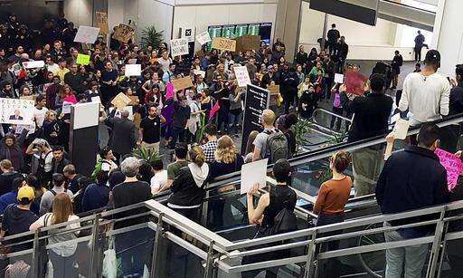 More than 100 protesters and dozens of immigration attorneys have gathered at the international arrivals terminal at Dulles International Airport outside Washington, cheering people arriving from Muslim countries. The crowd chanted "No ban, no wall" and other slogans, and at one point sang "The Star-Spangled Banner."