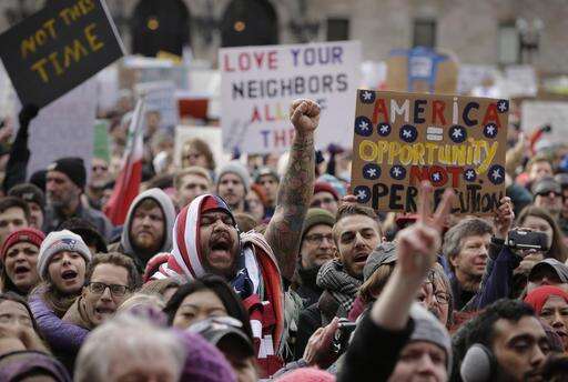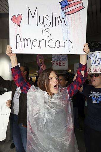 Trump says in a statement Sunday amid widespread protests that "America is a proud nation of immigrants." He says the country "will continue to show compassion to those fleeing oppression," but "while protecting our own citizens and border."