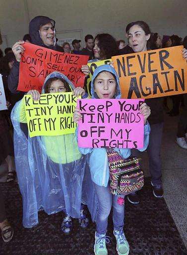 The protesters gathered Sunday evening at Westlake Park in the middle of the city's downtown shopping district. Some held signs that read "Proud to be an Immigrant" or "Refugees are not terrorists."