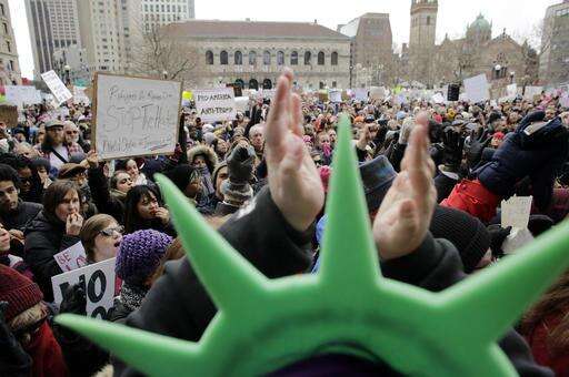 Demonstrators filled Copley Square in Boston on Sunday afternoon to protest Trump's order and his pledge to build a wall along the U.S. border with Mexico.