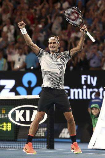 Switzerland's Roger Federer celebrates after defeating Spain's Rafael Nadal in the men's singles final at the Australian Open tennis championships in Melbourne, Australia, Sunday, Jan. 29, 2017. (Scott Barbour/Pool via AP) The Associated Press