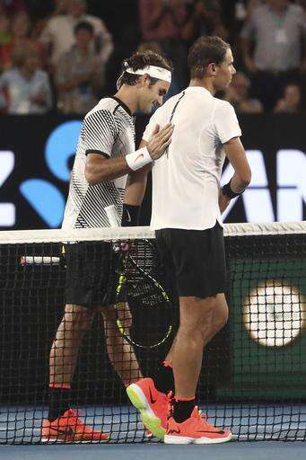 Switzerland's Roger Federer, left, is congratulated by Spain's Rafael Nadal after winning the men's singles final at the Australian Open tennis championships in Melbourne, Australia, Sunday, Jan. 29, 2017. (Scott Barbour/Pool via AP) The Associated Press