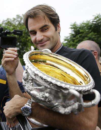 Switzerland's Roger Federer, right, talks to reporters as he holds his Australian Open trophy at Carlton Gardens in Melbourne, Australia, Monday, Jan. 30, 2017. Federer defeated Spain's Rafael Nadal in the men's final at the Australian Open tennis championships on Sunday. (AP Photo/Aaron Favila) The Associated Press