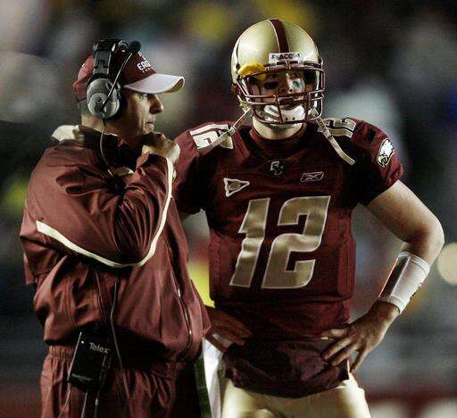 FILE - In this Saturday, Nov. 3, 2007, file photo, Boston College quarterback Matt Ryan, right, stands on the sidelines with head coach Jeff Jagodzinski during the fourth quarter of their 27-17 loss to Florida State in an NCAA college football game, in Boston. There’s one opponent who has escaped the fury of the fans in Foxborough, Mass., and even has a considerable amount of goodwill in the heart of New England. In fact, it’s hard to find any kind of animosity toward Atlanta Falcons quarterback Matt Ryan, who built his reputation at Boston College and will face the Patriots in the Super Bowl. (AP Photo/Winslow Townson, File) The Associated Press