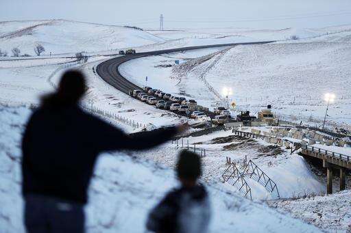 FILE- In this Dec. 3, 2016, file photo, law enforcement vehicles line a road leading to a blocked bridge next to the Oceti Sakowin camp where people have gathered to protest the Dakota Access oil pipeline in Cannon Ball, N.D. North Dakota Sen. John Hoeven said Tuesday, Jan. 31, 2017, that the Acting Secretary of the Army has directed the Army Corps of Engineers to proceed with an easement necessary to complete the Dakota Access pipeline. (AP Photo/David Goldman, File) The Associated Press