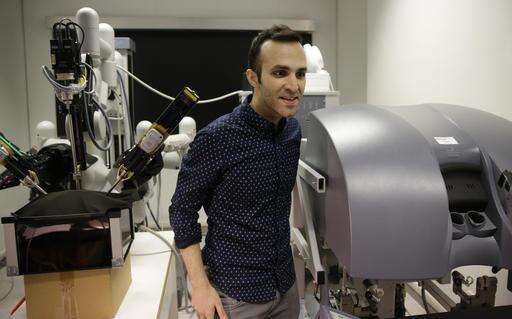 Iranian-born bioengineer researcher Nima Enayati stands as he works on a robotic surgery machine during an interview with the Associated Press at the Polytechnic University of Milan, Italy, Tuesday, Jan. 31, 2017. An Iranian researcher at Milan's Polytechnic University, Enayati was refused check-in Monday at Milan's Malpensa Airport for his U.S.-bound flight on Turkish Airlines after the Trump administration's executive order came down. (AP Photo/Luca Bruno)