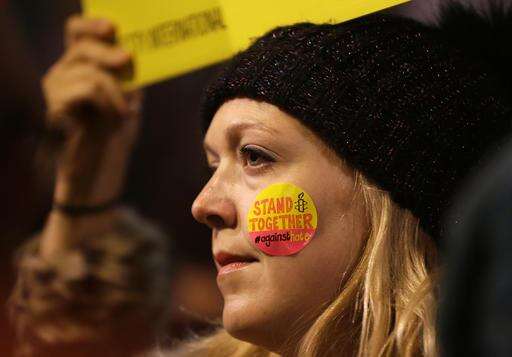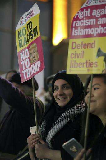 Demonstrators take part in a protest against US President Donald Trump's controversial travel ban on refugees and people from seven mainly-Muslim countries, in Glasgow, Scotland, Monday, Jan. 30, 2017. (Andrew Milligan/PA via AP) The Associated Press