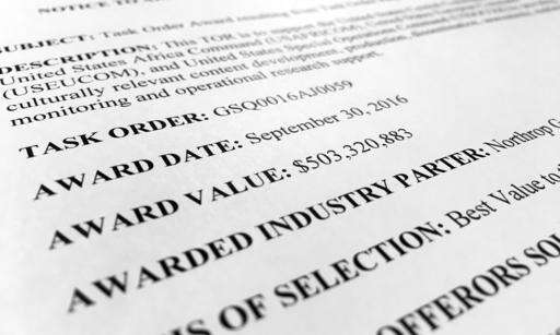 This document, photographed in Washington on Tuesday, Jan. 17, 2017, details the announcement of a five-year, $500 million contract awarded to Northrop Grumman on Sept. 30, 2016. The contract, for an expanded psychological operations campaign against the Islamic State and other extremist groups, is one of the largest such efforts to date. Contractors with some of Northrop Grumman’s competitors allege that a close relationship between one of the defense giant’s subcontractors and officers at Central Command gave the company an inside track on the bid. (AP Photo/Jon Elswick) The Associated Press