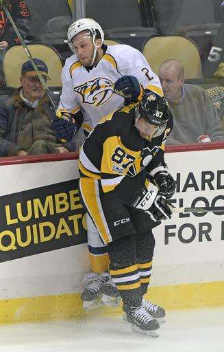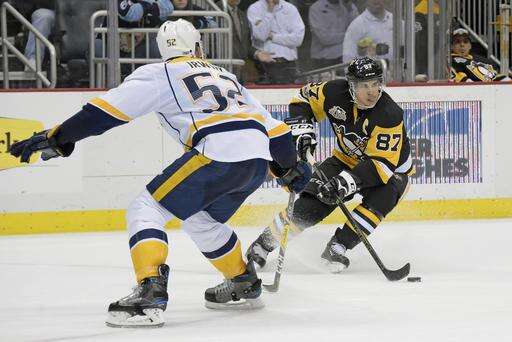 Pittsburgh Penguins center Sidney Crosby (87) checks Nashville Predators defenseman Anthony Bitetto (2) during the first period of an NHL hockey game Tuesday, Jan. 31, 2017, in Pittsburgh. (AP Photo/Fred Vuich) The Associated Press