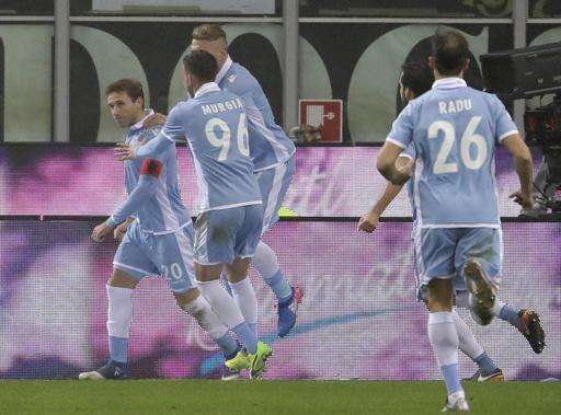 Lazio's Lucas Biglia, left, celebrates after scoring on a penalty kick during an Italian Cup quarterfinal soccer match between Inter Milan and Lazio, at the San Siro stadium in Milan, Italy, Tuesday, Jan. 31, 2017. (AP Photo/Luca Bruno) The Associated Press