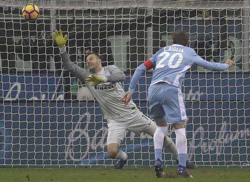 Lazio's Lucas Biglia beats Inter Milan goalkeeper Samir Handanovic to score on a penalty kick during an Italian Cup quarterfinal soccer match between Inter Milan and Lazio, at the San Siro stadium in Milan, Italy, Tuesday, Jan. 31, 2017. (AP Photo/Luca Bruno) The Associated Press