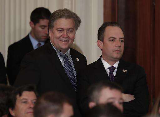 Steve Bannon, chief White House strategist to President Donald Trump, left, and White House Chief of Staff Reince Priebus stand in the East Room of the White House in Washington, Tuesday, Jan. 31, 2017, before President Donald Trump arrives to announce Judge Neil Gorsuch as his nominee for the Supreme Court. (AP Photo/Carolyn Kaster) The Associated Press