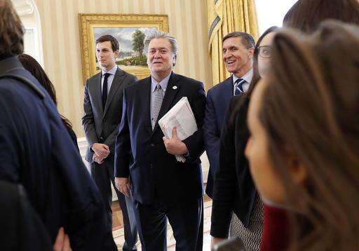 In this Jan. 27, 2017, photo, from left, White House senior advisers Jared Kushner, Steve Bannon and National Security Adviser Michael Flynn are seen in the Oval Office of the White House in Washington during a meeting between President Donald Trump and British Prime Minister Theresa May. The Trump administration is playing down the significance of a National Security Council restructuring. But the president is treading new ground in making Bannon a regular at NSC meetings. (AP Photo/Pablo Martinez Monsivais) The Associated Press