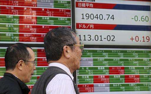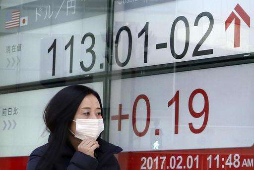 Men look at an electronic stock indicator of a securities firm showing the currency rate of the U.S. dollar that is traded at 113.01-02 yen in Tokyo, Wednesday, Feb. 1, 2017. Shares were mostly higher in Asia on Wednesday, lifted by upbeat manufacturing data from China and Japan. (AP Photo/Shizuo Kambayashi) The Associated Press