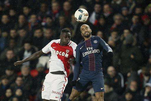 PSG's Lucas, right, and Monaco's Benjamin Mendy challenge to head the ball during their League One soccer match, at the Parc des Princes stadium, in Paris, France, Sunday, Jan. 29, 2017. (AP Photo/Thibault Camus) The Associated Press