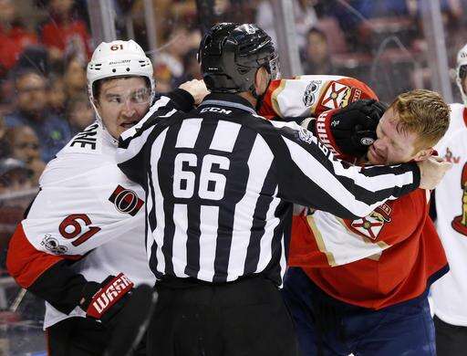 Ottawa Senators right wing Mark Stone (61) and Florida Panthers defenseman Michael Matheson fight as linesman Darren Gibbs separates them during the first period of an NHL hockey game, Tuesday, Jan. 31, 2017, in Sunrise, Fla. (AP Photo/Wilfredo Lee) The Associated Press