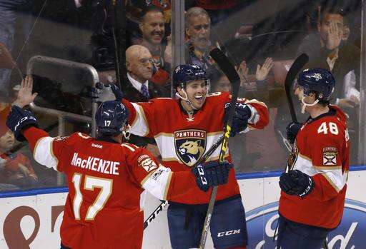 Florida Panthers center Jonathan Marchessault, center, celebrates his goal with center Derek MacKenzie (17) and center Michael Sgarbossa (48) during the third period of the team's NHL hockey game against the Ottawa Senators, Tuesday, Jan. 31, 2017, in Sunrise, Fla. The Panthers defeated the Senators 6-5. (AP Photo/Wilfredo Lee) The Associated Press
