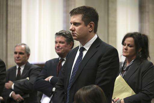 Chicago police officer Jason Van Dyke, center, attends a status hearing at the Leighton Criminal Court building Friday, Feb. 3, 2017. Van Dyke is in court on charges of first-degree murder in the shooting of Laquan McDonald. (Antonio Perez /Chicago Tribune via AP, Pool) The Associated Press