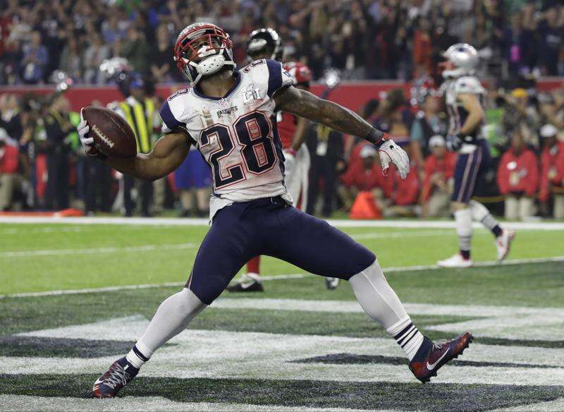 New England Patriots' James White celebrates after scoring a touchdown during the second half of the NFL Super Bowl 51 football game against the Atlanta Falcons, Sunday, Feb. 5, 2017, in Houston. ASSOCIATED PRESS