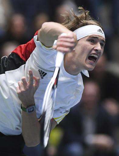 Germany's Alexander Zverev serves a ball to Belgium's Steve Darcis during their Davis Cup first round tennis match Germany versus Belgium, in Frankfurt, Germany, Sunday, Feb. 5, 2017. (Arne Dedert/dpa via AP) The Associated Press