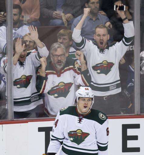 Fans celebrate after Minnesota Wild's Mikael Granlund, of Finland, scored his third goal against the Vancouver Canucks, during the third period of an NHL hockey game Saturday, Feb. 4, 2017, in Vancouver, British Columbia. (Darry Dyck/The Canadian Press via AP) The Associated Press