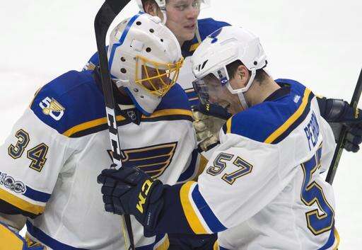 St. Louis Blues left wing David Perron (57) congratulates goalie Jake Allen (34) on his shutout as the Blues defeated the Ottawa Senators 6-0 during an NHL hockey game Tuesday, Feb. 7, 2017, in Ottawa, Ontario. (Adrian Wyld/The Canadian Press via AP) The Associated Press