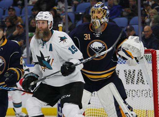 Buffalo Sabres goalie Anders Nilsson (31) is screened by San Jose Sharks forward Joe Thornton (19) during the second period of an NHL hockey game, Tuesday, Feb. 7, 2017, in Buffalo, N.Y. (AP Photo/Jeffrey T. Barnes) The Associated Press