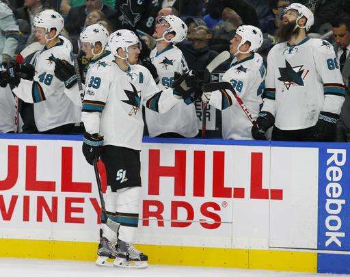 San Jose Sharks forward Logan Couture (39) celebrates his goal during the first period of an NHL hockey game against the Buffalo Sabres, Tuesday, Feb. 7, 2017, in Buffalo, N.Y. (AP Photo/Jeffrey T. Barnes) The Associated Press