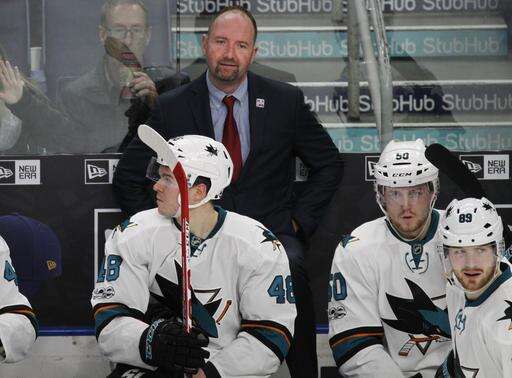San Jose Sharks head coach Peter DeBoer looks on during the third period of an NHL hockey game against the Buffalo Sabres, Tuesday, Feb. 7, 2017, in Buffalo, N.Y. (AP Photo/Jeffrey T. Barnes) The Associated Press
