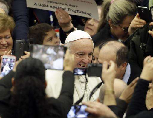Pope Francis is surrounded by faithful, including one holding a poster against human trafficking, during his weekly general audience in Paul VI Hall, at the Vatican, Wednesday, Feb. 8, 2017. The Vatican has been hosting a conference on human trafficking as part of Francis' efforts to crack down on trafficking in humans and organs. (AP Photo/Andrew Medichini) The Associated Press