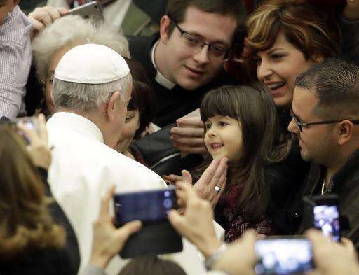 Pope Francis caresses a child during his weekly general audience in Paul VI Hall, at the Vatican, Wednesday, Feb. 8, 2017. (AP Photo/Andrew Medichini) The Associated Press