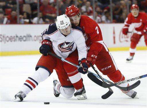Columbus Blue Jackets center William Karlsson (25) and Detroit Red Wings defenseman Brendan Smith (2) battle for the puck in the second period of an NHL hockey game Tuesday, Feb. 7, 2017, in Detroit. (AP Photo/Paul Sancya) The Associated Press