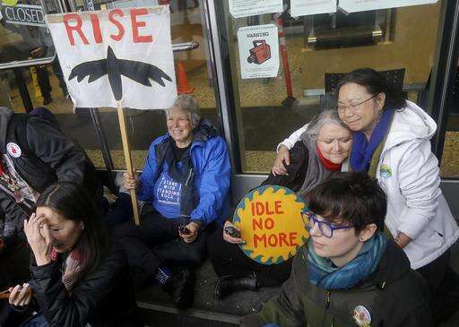 Pennie Opal Plant, second from top right, and other opponents of the Dakota Access oil pipeline block an entrance to the San Francisco Federal Building in San Francisco, Wednesday, Feb. 8, 2017. Opponents of the Dakota Access oil pipeline called for protests around the world Wednesday as the Army prepared to greenlight the final stage of the $3.8 billion project's construction. (AP Photo/Jeff Chiu)