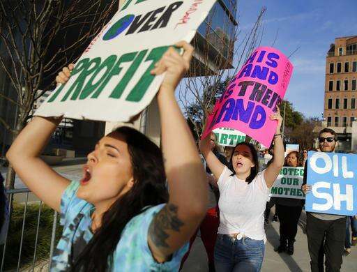 People march outside developer Energy Transfer Partners headquarters, protesting the Army Corps of Engineers approval of the final section of the Dakota Access oil pipeline, Tuesday, Feb. 7, 2017. The Army said Tuesday that it will allow the $3.8 billion Dakota Access oil pipeline to cross under a Missouri River reservoir in North Dakota, clearing the way for completion of the disputed four-state project. (Tom Fox/The Dallas Morning News via AP)