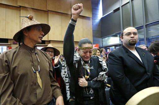 Olivia One Feather, center, of the Standing Rock Sioux tribe, holds her fist up and cries tears of happiness after the Seattle City Council voted to divest from Wells Fargo over its role as a lender to the Dakota Access pipeline project and other business practices, Tuesday, Feb. 7, 2017, in Seattle. Wells Fargo manages more than $3 billion of Seattle's operating account. (AP Photo/Elaine Thompson)