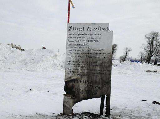 A sign is seen at an encampment set up near Cannon Ball, N.D., Wednesday, Feb. 8, 2017, for opponents against the construction of the Dakota Access pipeline. Opponents have called for protests around the world Wednesday, Feb. 8, 2017, as the Army prepared to green-light the final stage of the $3.8 billion project's construction. The Army said Tuesday, Feb. 7, that it will allow the four-state pipeline to cross under a Missouri River reservoir in North Dakota, the last big chunk of construction. (AP Photo/James MacPherson)