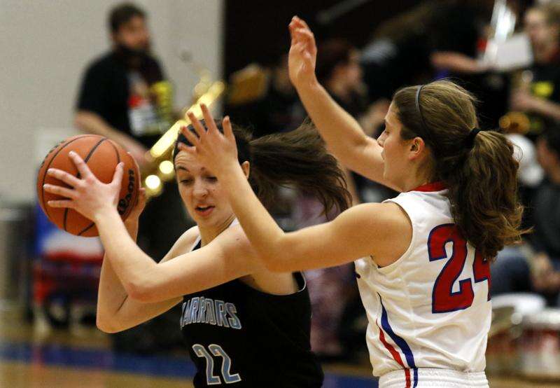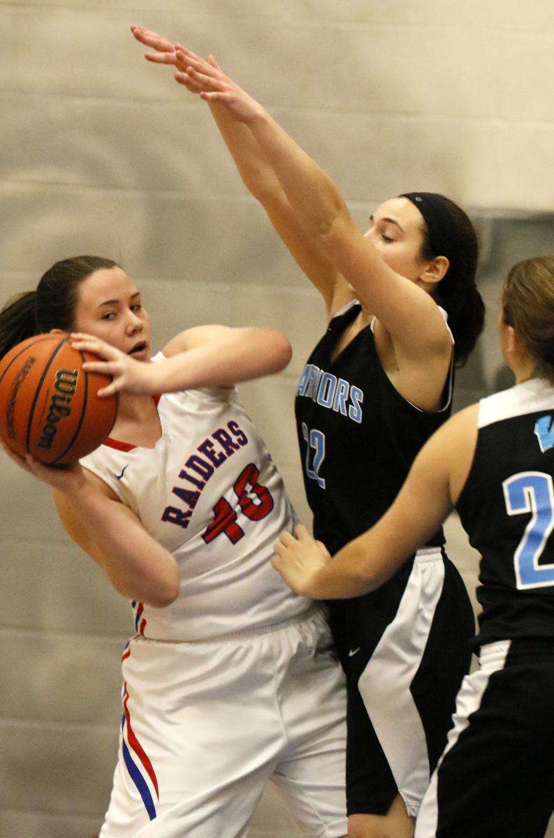 Willowbrook's Hanna Konrath, left, defends against Glenbard South's Raquel LaPonte, right, during girls basketball action in Glen Ellyn. Glenbard South defeated Willowbrook 54-42.
