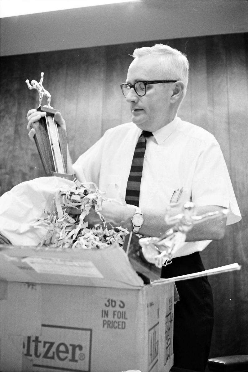 Bob Paddock unpacks trophies for the Paddock Publications bowling league.