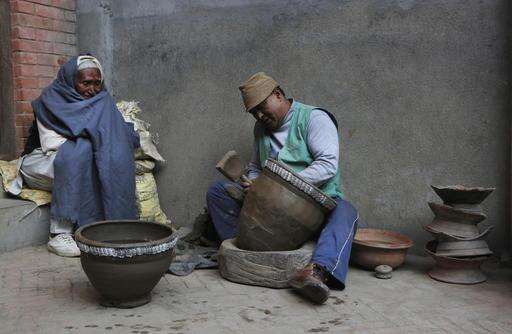 In this Wednesday, Jan. 25, 2017 photo, Nepalese Prajapati potter Bishnu Bahadur Prajapati, 53, works on a clay pot watched by his elderly neighbor Kaji Bahadur Prajapati, 90, in the ancient Nepali town of Thimi. In the past, Prajapati potters would travel across the country to sell their wares. That practice has already died out as more durable material replaced clay pots. Of the nearly 2,000 Prajapati families in town, less than 300 families now depend on clay pottery for a living. (AP Photo/Niranjan Shrestha)