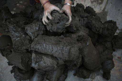 In this Saturday, Jan. 28, 2017 photo, a Nepalese Prajapati potter works with clay that will be moulded into pots in the ancient Nepali town of Thimi. For generations, the residents of Thimi supplied the rest of the Himalayan country everything from tiny clay lamps used in temples to massive grain storage jars. As more young people leave town for better paying jobs in other parts of Nepal or abroad, fewer families have to eke out an income from the relatively low-returns business of clay pottery. Of the nearly 2,000 Prajapati families in town, less than 300 families now depend on clay pottery for a living. (AP Photo/Niranjan Shrestha)