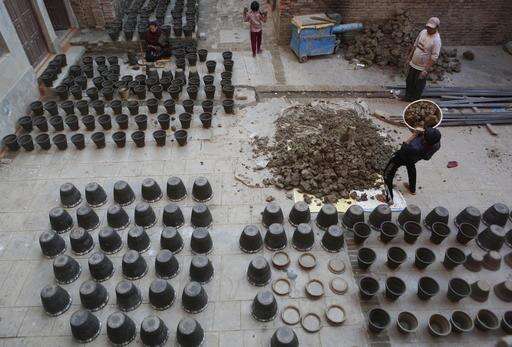 In this Wednesday, Jan. 25, 2017 photo, a Nepalese Prajapati potter carries a pot to dry in the ancient Nepali town of Thimi. For generations, the residents of Thimi supplied the rest of the Himalayan country everything from tiny clay lamps used in temples to massive grain storage jars. As more young people leave town for better paying jobs in other parts of Nepal or abroad, fewer families have to eke out an income from the relatively low-returns business of clay pottery. Locals say that potter can earn 20,000 Nepali rupees ($200) a month and doesn't match up to what young people from the town can make in other jobs abroad and in bigger cities. (AP Photo/Niranjan Shrestha)