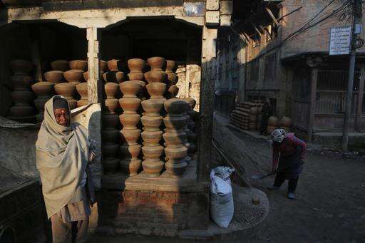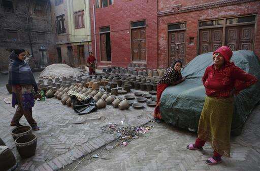 In this Friday, Feb. 10, 2017 photo, Nepalese Prajapati potters take a break in between making clay pots in the ancient Nepali town of Thimi. For generations, the residents of Thimi supplied the rest of the Himalayan country everything from tiny clay lamps used in temples to massive grain storage jars. As more young people leave town for better paying jobs in other parts of Nepal or abroad, fewer families have to eke out an income from the relatively low-returns business of clay pottery. Of the nearly 2,000 Prajapati families in town, less than 300 families now depend on clay pottery for a living. (AP Photo/Niranjan Shrestha)