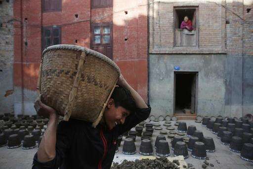 In this Friday, Feb. 10, 2017 photo, a Nepalese Prajapati potter carries a basket filled with clay to make into clay pots in the ancient Nepali town of Thimi. For generations, the residents of Thimi supplied the rest of the Himalayan country everything from tiny clay lamps used in temples to massive grain storage jars. As more young people leave town for better paying jobs in other parts of Nepal or abroad, fewer families have to eke out an income from the relatively low-returns business of clay pottery. What has kept the tradition alive, for now, is the flow of tourists who buy artistic clay pots as souvenirs, and also because clay pots are still used in certain Hindu and Buddhist rituals. (AP Photo/Niranjan Shrestha)