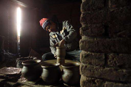 In this Wednesday, Jan. 25, 2017 photo, a Nepalese Prajapati potter moulds a clay pot in a potters wheel in the ancient Nepali town of Thimi. For generations, the residents of Thimi supplied the rest of the Himalayan country everything from tiny clay lamps used in temples to massive grain storage jars. As more young people leave town for better paying jobs in other parts of Nepal or abroad, fewer families have to eke out an income from the relatively low-returns business of clay pottery. Of the nearly 2,000 Prajapati families in town, less than 300 families now depend on clay pottery for a living. (AP Photo/Niranjan Shrestha)