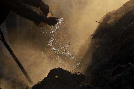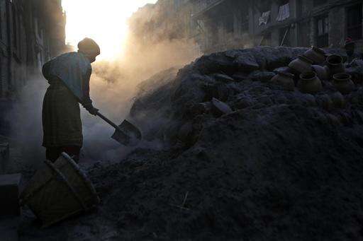 In this Thursday, Jan. 26, 2017 photo, Nepalese Prajapati potter Mohan Laxmi Prajapati splashes water before taking out pots that are being baked to harden in the ancient Nepali town of Thimi. For generations, the residents of Thimi supplied the rest of the Himalayan country everything from tiny clay lamps used in temples to massive grain storage jars. As more young people leave town for better paying jobs in other parts of Nepal or abroad, fewer families have to eke out an income from the relatively low-returns business of clay pottery. Of the nearly 2,000 Prajapati families in town, less than 300 families now depend on clay pottery for a living. (AP Photo/Niranjan Shrestha)