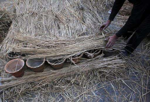 In this Thursday, Jan. 26, 2017 photo, a Nepalese Prajapati potter covers clay pots with hay before baking it to harden in the ancient Nepali town of Thimi. For generations, the residents of Thimi supplied the rest of the Himalayan country everything from tiny clay lamps used in temples to massive grain storage jars. As more young people leave town for better paying jobs in other parts of Nepal or abroad, fewer families have to eke out an income from the relatively low-returns business of clay pottery. Of the nearly 2,000 Prajapati families in town, less than 300 families now depend on clay pottery for a living. (AP Photo/Niranjan Shrestha)